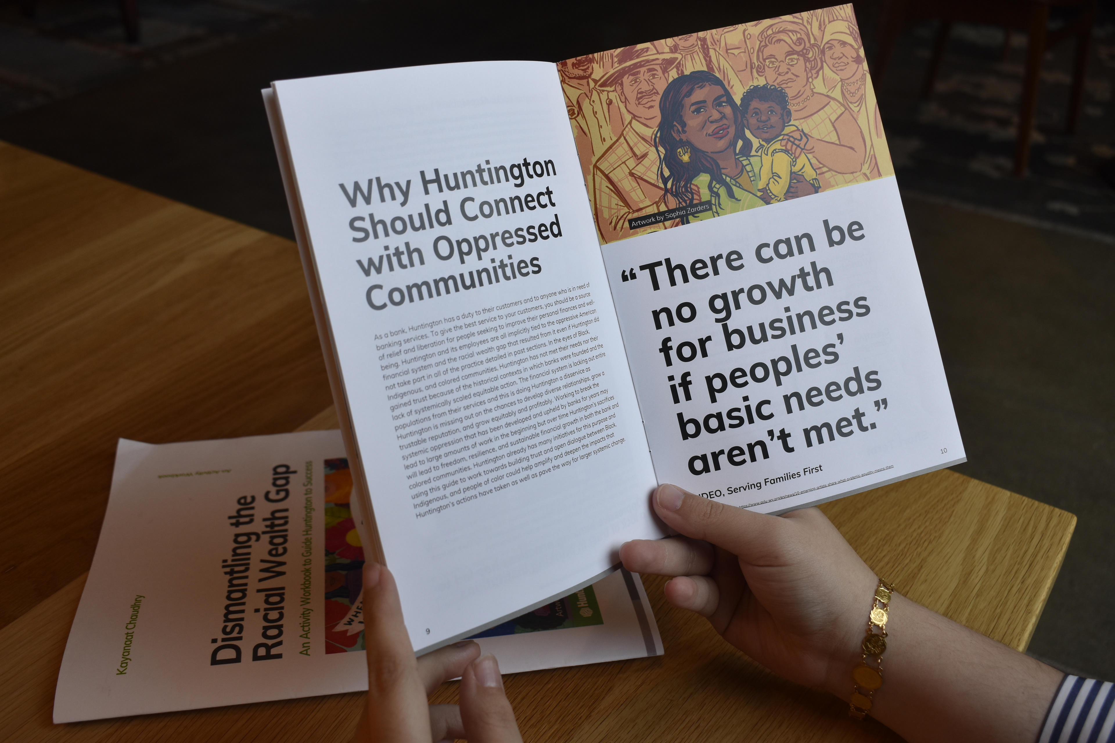 Dismantling the Racial Wealth Gap is a design intervention completed in partnership with Huntington National Bank. It is the action plan and research tools needed for Huntington to build trusting, active, and equitable relationships with Black, Indigenous, and people of color (BIPOC) communities that have been oppressed and exploited by the United States financial system. To help Huntington understand how to implement this intervention, a guidebook and activity workbook were created. Through this process, Huntington can start outlining how the American financial system created a racial wealth gap through the systems of oppression they are situated in, establish relationships, and work towards systemic change with BIPOC communities.